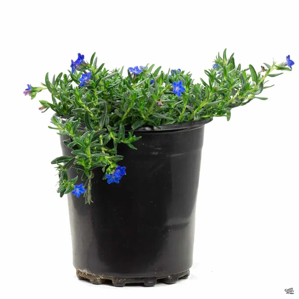 Beautiful deep blue flowers cover this wonderful sprawling groundcover. The slightly mounded form adds softness and color to the top of retaining walls. Works well as a rock garden accent, softly flowing between boulders.