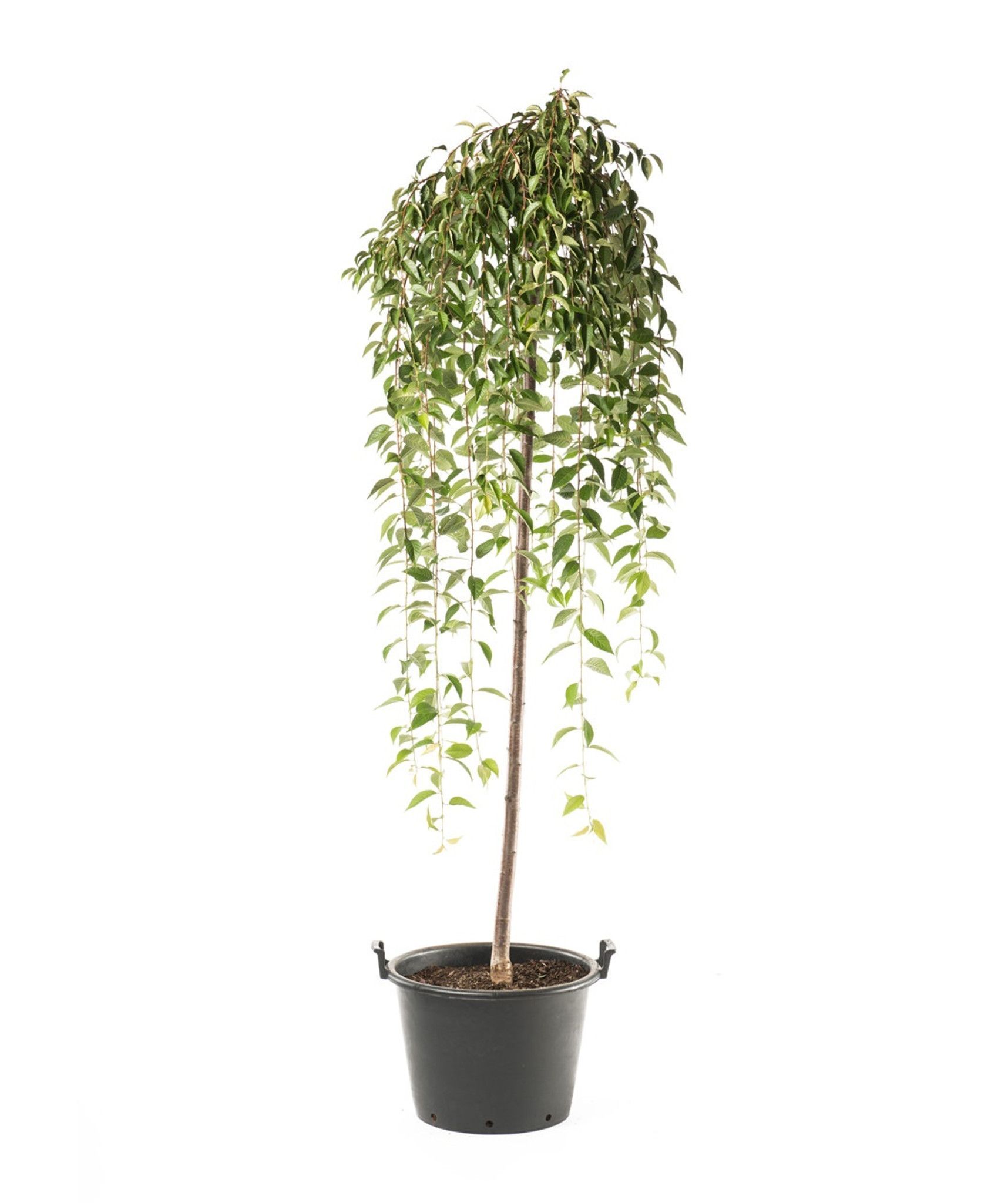 A graceful ornamental tree admired for its arching, weeping branches and spectacular spring blossom display. In early spring, the tree becomes covered in soft pink to pale rose flowers, creating a stunning fountain-like effect. Delicate green foliage follows, turning golden-yellow in fall. Its elegant form and seasonal beauty make it a favorite focal point for gardens, entryways, and landscape accents.