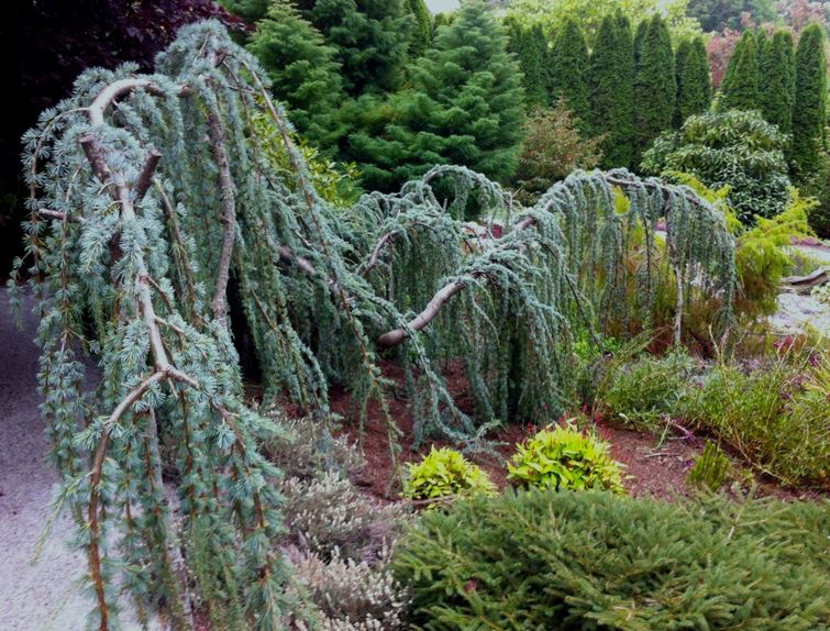 Cedrus atlantica ‘Glauca Pendula’ (Weeping Blue Atlas Cedar) ‘Glauca Pendula’ is a striking, evergreen conifer known for its cascading, pendulous branches and silvery-blue needles. Its dramatic, sculptural form makes it ideal as a specimen tree or focal point in large landscapes and formal gardens.