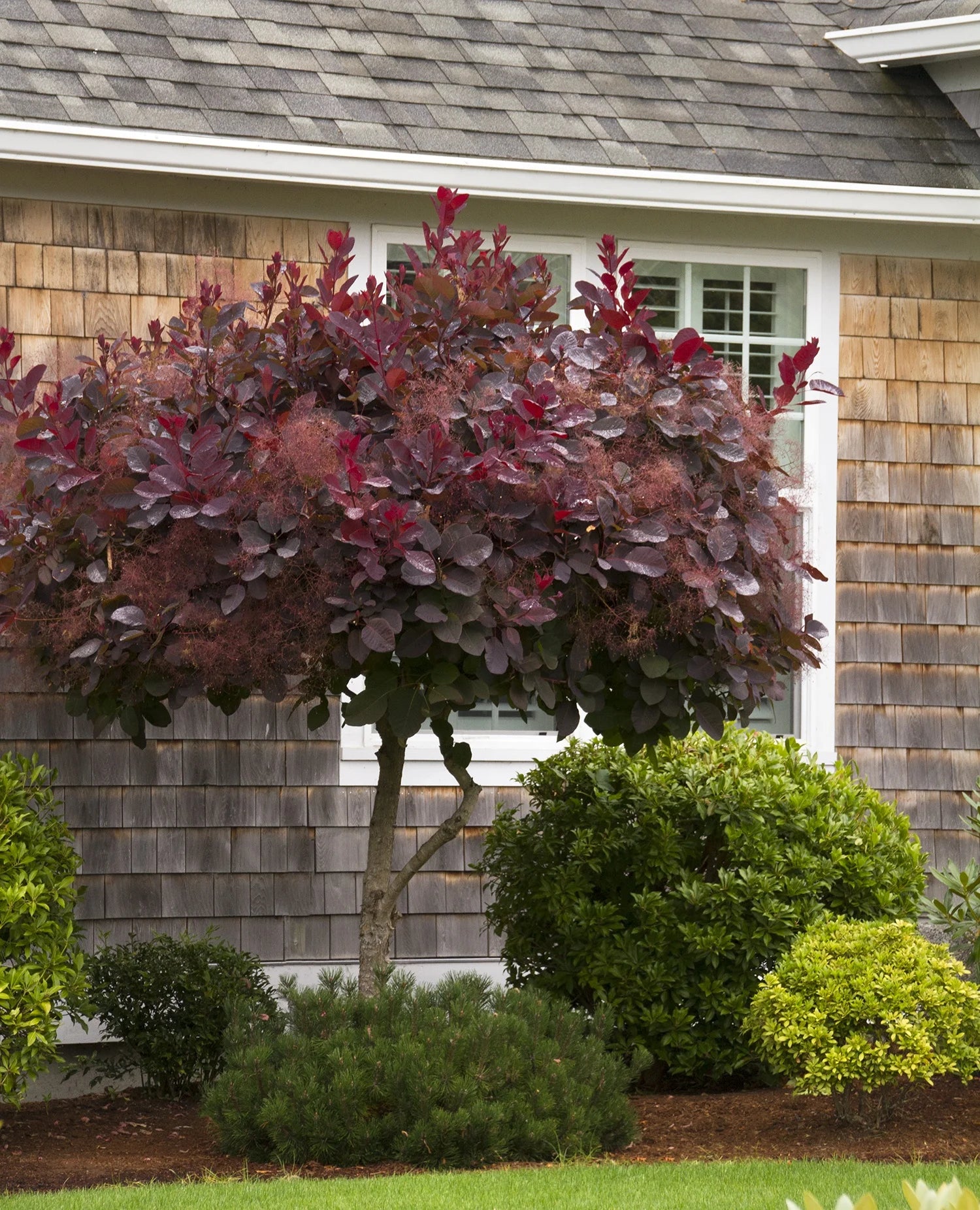 Cotinus coggygria ‘Royal Purple’ (Royal Purple Smokebush) – Single Trunk ‘Royal Purple’ trained as a single-trunk tree form showcases its rich burgundy-purple foliage and airy, smoke-like flower plumes in a more formal, tree-like structure. Blooming in early summer, it provides dramatic color and texture, making it an excellent specimen tree or focal point in landscapes and gardens.