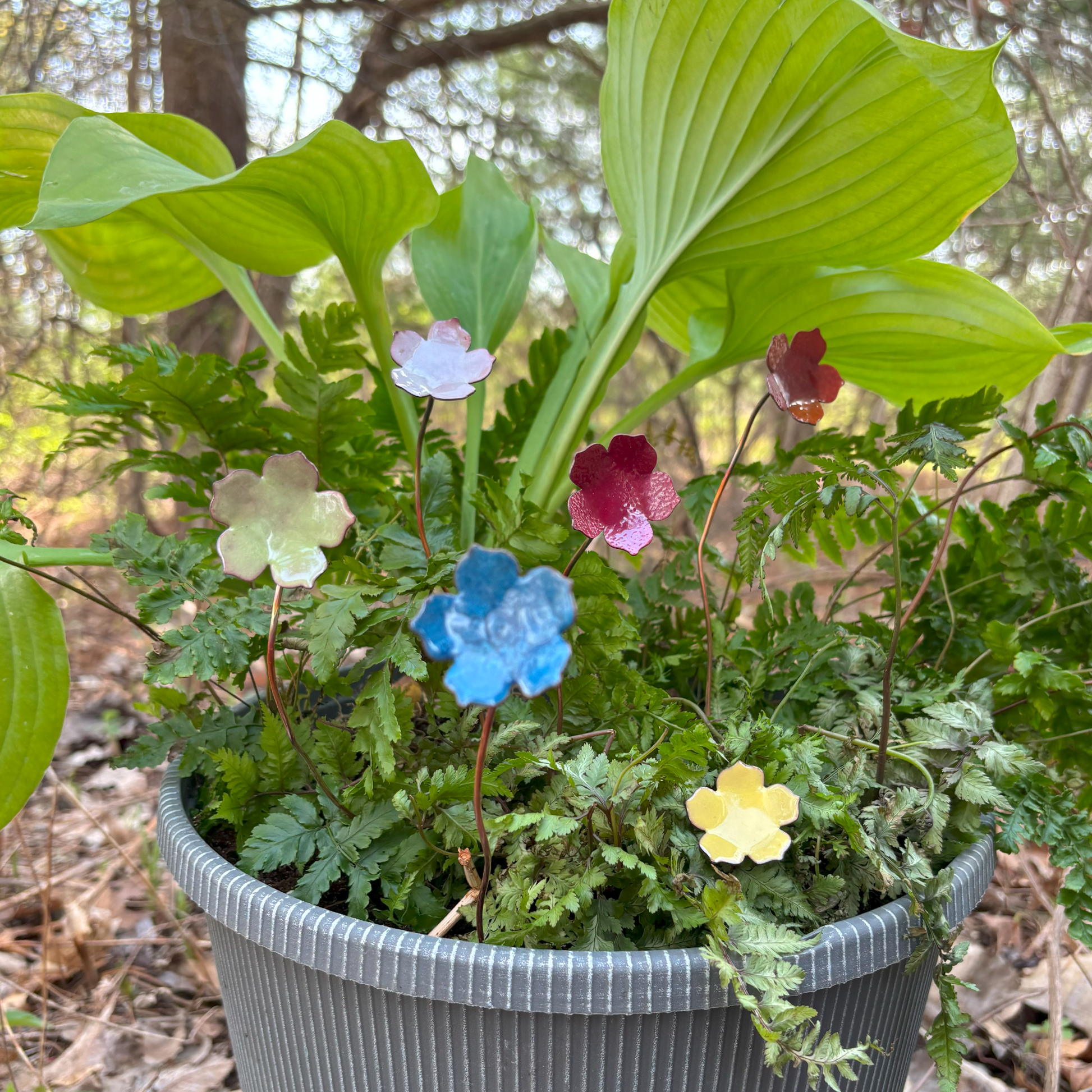 Each piece is handcrafted by artisans in Michigan. We use real copper to create our pieces. We use torch fire enameling to create enduring colors on our enameled items. Our natural copper areas will patina over time.