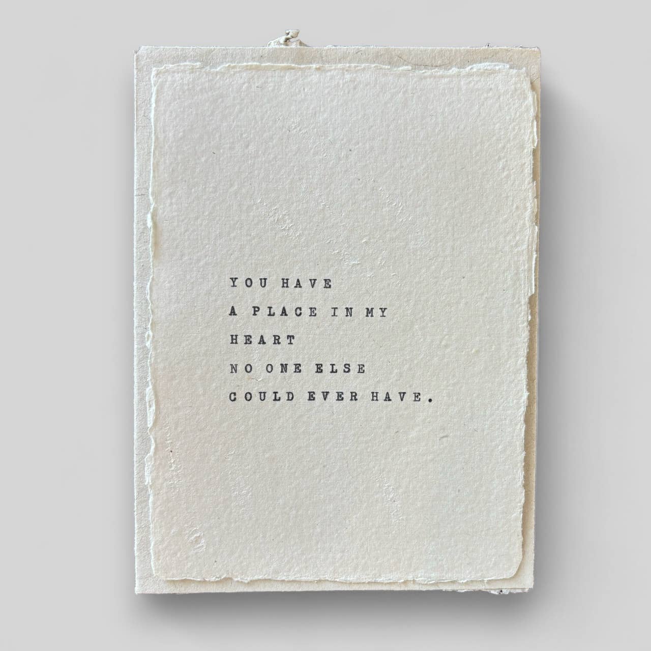 Handtypewritten with our Royal manual typewriter onto beautiful handmade paper made in Toronto, Canada. Measures 4.25 by 6 inches and comes with a beautiful deckled envelope. This is a one panel card left blank in the back for your own personal message.