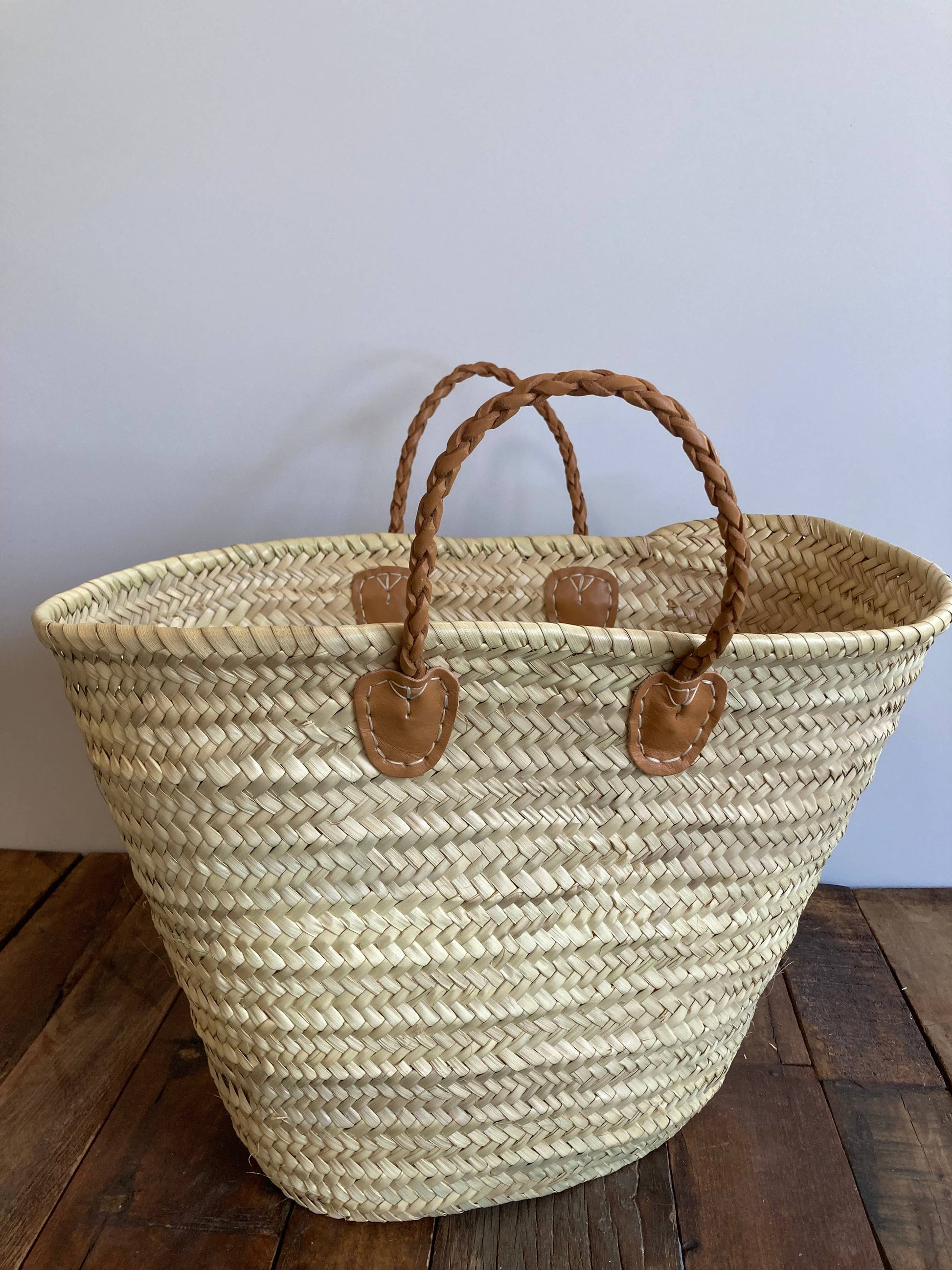 This is a lovely twist on the traditional market basket. The handle is a lovely, sturdy braided dark leather, short for looping over the arm. Basket is large and sturdy and perfect for beach or market or every-day use.
