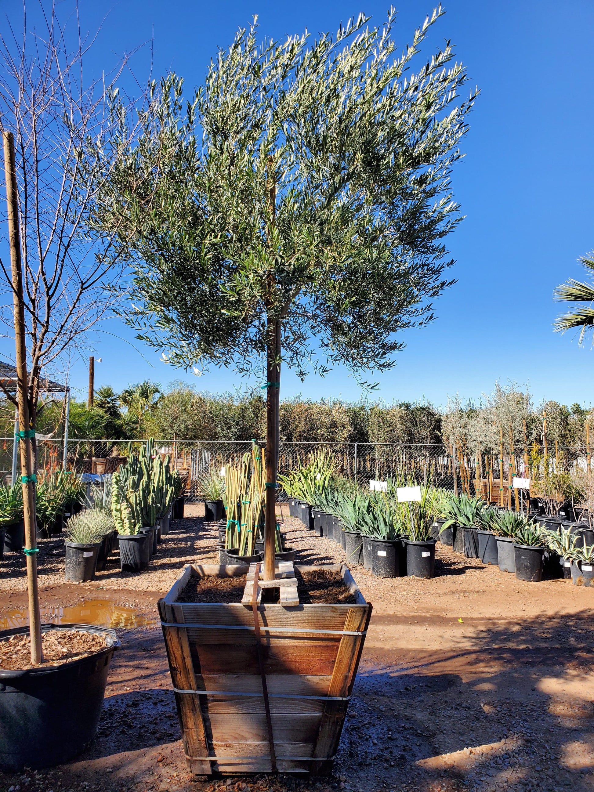 Olea europaea ‘Arizona’ (Arizona Fruitless Olive) ‘Arizona’ is a drought-tolerant, fruitless olive tree valued for its broad canopy, twisting trunk, and soft gray-green foliage. Well-suited for hot, dry climates, it provides excellent shade and a classic Mediterranean look without the mess of fallen fruit.
