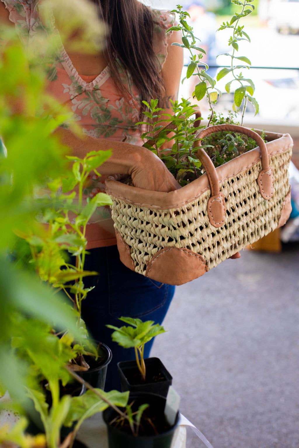 Open Weave Basket with Leather Trim